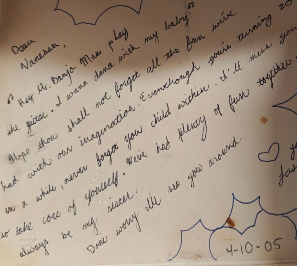 The picture above is of a gum box with an adorable note from an old co-worker. As you can see, it’s been a while. I’ve kept it all this time because – not only do I keep every special letter I’ve ever received – it’s from one of those few precious people I’ve met along the way that joined me, in imagination. Lassie was awesome. She made work go by so quickly and fun and went along with whatever crazy story we’d come up with. She literally took an empty gum box from the register and made a guitar out of it with rubber bands and gave it to me as a birthday gift.ย It’s one of the best gifts I’ve ever gotten. Why? Because she saw me and used her imagination, her self-expression. She showed me herself, too.